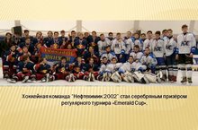 Хоккейная команда “Нефтехимик 2002” стал серебряным призёром регулярного турнира «Emerald Cup», прошедшего в Нижнем Новгороде. В соревнованиях приняло участие 8 команд из России, Австрии, Беларуси. «Нефтехимик-2002» сумел выйти в финал турнира, одолев в групповом этапе нижегородское «Торпедо» (1:0) и чемпиона Республики Беларусь, минскую ХК «Юность» (3:1), проиграв только команде из Зальцбурга «Ред Булл» (2:6). В составе австрийской команды были собраны представители разных европейских национальностей и народностей – чехи, финны, немцы, австрийцы.