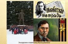 В преддверии Дня защитника Отеччесмтва обучающиеся 3 “А” класса посетили памятник Мусе Джалилю. Залилов Муса Мустафович (Муса Джалиль) - татарский поэт, герой Советского союза Участник Гражданской войны. . В июле 1941 года был призван в Красную Армию. Окончил шестимесячные курсы политработников и в звании старшего политрука направлен на Волховский фронт. До июля 1942 года работал военным корреспондентом армейской газеты "Отвага". Раненный в грудь, без сознания Муса Джалиль попадает в руки врага. Годы плена стали для Мусы Джалиля великими. Он сумел организовать пленных на борьбу с фашизмом. Был приговорён к смерти. 25 августа 1944 года казнён на гильотине в тюрьме Плётцензее в Берлине. В тюрьме он создал 115 поэтических произведений. Его записные книжки со стихами были сохранены товарищем по заключению бельгийским антифашистом Андре Тиммермансом. После войны Тиммерманс передал их советскому консулу. Стихи были возвращены на Родину.