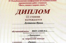 Поздравляем Духтанову Ирину, занявшую III место в номинации «Рисунок» IV Республиканской конференции исследовательских и краеведческих работ учащихся «Жить, помня о корнях своих…» (педагог Глухарева И.С.) Сертификатами участников конференции награждены Ильязова Алия, Глухарев Никита, Фирстова Милена, Сайфутдитнова Алия,Халиуллин Самат, Кудряшов Олег, Яковлев Егор,Анваров Тимур представившие свои работы в творческом конкурсе.