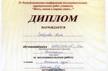 В IV Республиканской конференции исследовательских краеведческих работ учащихся "Жить, помня о корнях своих..." среди исследовательских работ дипломом награждена работа обучающейся 8 «А» класса Сабировой Алии (педагог Сабирова Р.Д.). Сертификатами отмечены работы Ягофарова Айрата, Ташмурзина Станислава (учитель Сафонова И.Н.)