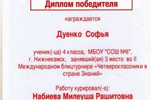 Поздравляем Дуенко Софью, занявшую III место во II Международном блиц турнире «Четвероклассники в стране Знаний».