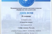 Поздравляем Сайфутдинову Рамзию, занявшую II место в номинации «Симпатия жюри» в муниципальном конкурсе рисунков и поделок «профессия моих родителей» Руководитель Хузина Г.Р.