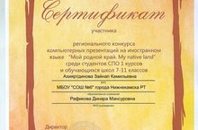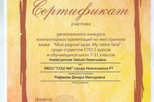 Поздравляем Ахияртдинову Зайнап, принявшую участие в региональном конкурсе компьютерных презентаций на иностранном языке «Мой край родной» среди студентов СПО и обучающихся 7-11 классов школ. Педагог Рафикова Д.М.