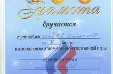 Поздравляем Никитину татьяну, учащуюся 9 Б кл., занявшую II место в зональном этапе военно -спортивной игре "Зарница" в беге на 60 метров.