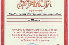 Поздравляем учиттля технологии Ганиеву Г.А. и заместителя директора по ВР Глухареву И.С. занявших III место в конкурсе - выставке цветочных композиций в рамках Августовской конференции работников образования Нижнекамского муниципального района РТ.