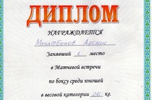 Поздравляем Манатбекова Арслана, ученика 3 Б класса, занявшего I место в Матчевой встречи по боксу среди юношей в весовой категории 26 кг.