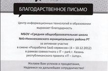 Центр информационных технологий в образовании выражает благодарность МБОУ "Средняя общеобразовательная школа №6 " Нижнекамского муниципального района РТ за активное участие в смене "Разработка SaaS - сервисов" (4-10.12.2012) в рамках совместного с IT park г.Казань республиканского проекта "IT Jump"/