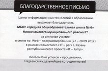 Центр информационных технологий в образований выражает благодарность МБОУ "Средняя общеобразовательная школа №6 " Нижнекамского муниципального района РТ за активное участие в смене Web - программированию (22-28.09.2012) в рамках совместного с IT - park г.Казань республиканского проекта "IT Jump".