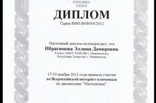 Диплом серии ВИО № 08054/2012. Настоящий диплом подтверждает, что Ибрагимова Эллина Дамировна, 8 класс, МБОУ СОШ №6 г.Нижнекамска,Республика Татарстан,г.Нижнекамк, 17-19 ноября приняла участие во Всероссийской интернет - оилмпиаде по джисциплине "Математика".