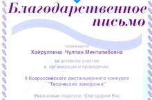 Благодарственным письмом награждена Хайруллина Чулпан Минталибовна за активное участие в организации и проведении II Всероссийского дистанционного конкурса "Творческие заморочки" ("Фактор роста"). Желаем дальнейших успехов в творческой работе и благодарим за активную позицию и профессионализм.