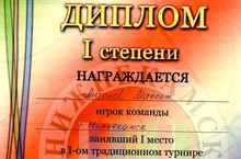 Дипломом I степени награждён ученик 3 класса нашей школы Антонов Максим - игрок команды, занявшей 1 место в I традиционном турнире городов России по баскетболу среди мальчиков 2002-2003 г.р., посвящённого памяти основателя отделения баскетбола в г.Нижнекамске Вячеслава Сечина.