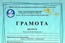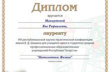 Поздравляем Махмутова Яну, ставшую дипломантом второй степени межрегиональной научно-практической конференции проектных и исследовательских работ школьников и педагогов "Наука и человек" имени Ш.М. Ахметшина (учитель Дорофеева Лилия Ильинична).