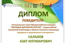 Поздравляем ученика 9А класса школы №6, воспитанника музыкальной школы, Салахова Азата, ставшего победителем Регионального этапа Общероссийского конкурса "Молодые дарования России".