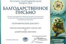 Географический диктант - ежегодное образовательное мероприятие, организуемое с 2015 года Русским географическим обществом с целью популяризации географических знаний и повышения интереса к географии России. Диктант проходит в форме теста как очно на специально организованных площадках в России и за рубежом, так и онлайн на сайте проекта. За 5 лет его участниками стали свыше 1,3 млн человек. Обучающиеся школы №6 под руководством учителя географии Деевой Рамзии Ахметовны стали активными участниками географического диктанта.
