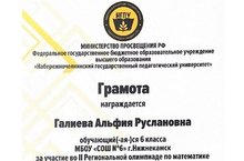 Поздравляем Галиеву Альфию, участника Региональной олимпиады по математике среди учащихся 5-6 классов, прошедшей на базе Камского математического центра "НГПУ" совместно со "Школково".