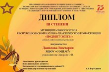 Поздравляем Данилову Викторию ученицу 7 а класса с диплом 3 степени муниципального конкурса «Подвигу жить» в номинации «Моя семейная реликвия» (педагог Сидорова О.Н)