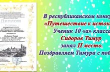 Поздравляем ученика 10 а класса Сидорова Тимура с победой в конкурсе " Путешествие к истокам" в номинации "Лучший экскурсионный маршрут"