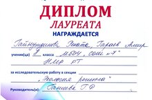 Учащиеся 8в класса Гайнутдинова Рената и Гараев Амир приняли участие в III региональной научно-практической конференции «Создание историко-культурного и духовного наследия России» где представив проект «ЭкоДом» в номинации «Экология региона», были удостоены диплома лауреата. Молодцы, наши начинающие исследователи в области науки и технике.