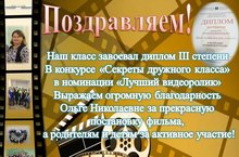 Завершился муниципальный конкурс "Секреты дружного класса" Родительский комитет 8 а класса стал обладателем диплома 3 степени в номинации "Лучший видеоролик" Поздравляем классного руководителя Сидорову О.Н и учеников 8а класса с результатом