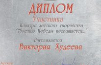 Ученица 1Б класса Худеева Виктория приняла участие в конкурс детского творчества «75-летию Победы посвящается…». Классный руководитель Кругляк Т.Г.