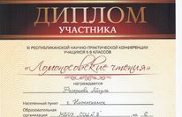 Поздравляем ученицу 6 класса Фахриеву Айгуль (руководитель: Матвеева С.Н.) с Дипломом участника Республиканской научно-практической конференции "Ломоносовские чтения" в секции "Математика, информатика".