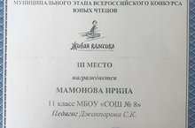 Поздравляем ученицу 11 класса Мамонову Ирину с почётным 3 местом в муниципальном этапе Всероссийского конкурса юных чтецов "Живая классика" (рук-ль: Джаппарова С.К.).