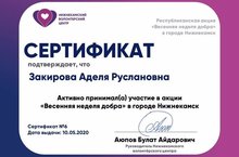 С 1 по 10 мая в рамках ежегодной общероссийской добровольческой акции «Весенняя неделя добра» были организованы и проведены серии добровольческих мероприятий с участием учащихся: Онлайн акции «Бессмертный полк» и «Окна Победы»; Рассказ-публикация в социальных сетях «Что для вас значит быть волонтером?»; Квиз-игра на тему «Донорство»; Курс «Основы волонтерства для начинающих». На протяжении всей акции ребята активно принимали участие во всех мероприятиях. В завершении «Весенней недели добра» участники получили сертификаты. #добрыйнижнекамск#доброволецнижнекамска