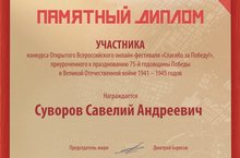 9 апреля 2020 года, телеканал «ПОБЕДА» дал старт Открытому Всероссийскому онлайн-фестивалю «Спасибо за Победу!». Главным событием стал творческий конкурс, на который участники могли прислать свои записи исполнения песен, стихов и прозы о Великой Отечественной войне и Победе. Лучшие работы попали в масштабный 75-часовой марафон выступлений участников Открытого Всероссийского онлайн-фестиваля «Спасибо за Победу!», который транслировался в эфире телеканала «ПОБЕДА» с 19:45 мск 6 мая и до самого завершения Дня Победы 9 мая. Ученик 1Г класса нашей школы Суворов Савелий принял участие исполнив стихотворение о войне (классный руководитель Щетинина Н.С.). По завершению народного голосования творческого конкурса, и по его результатам Савелий был награжден памятным дипломом участника! Поздравляем и желаем новых достижений!
