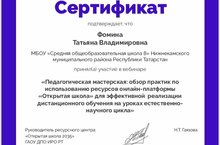 6 мая учитель математики Фомина Т.В. приняла участие в онлайн вебинаре на тему "Педагогическая мастерская: обзор практик по использованию ресурсов онлайн-платформы "Открытая школа" для эффективной реализации дистанционного обучения на уроках естественно-научного цикла". На вебинаре педагоги рассмотрели методы и приёмы использования материалов на образовательной платформе "Открытая школа". Все участники вебинара получили сертификаты.