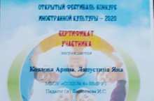 Козлова Арина, ученица 8б класса получила сертификат участника Открытого фестиваля конкурса Иностранной культуры – 2020. Педагог Лапшанова И.С.