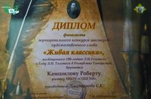 Диплом финалиста муниципального конкурса мастеров художественного слова "Живая классика", посвященного 190-летию Л.Н. Толстого и Году Л.Н. Толстого в Республике Татарстан, получил ученик нашенй школы Камшилов Роберт (руководитель: Джаппарова С.К.).