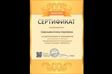 Золотым Сертификатом награждается Савельева Алена Сергеевна за организацию и проведение дистанционного конкурса: Международный интеллектуальный интернет - марафон "ЭДУКОНец" Руководитель ОЦ А.В. Данилова А.В. ПОЗДРАВЛЯЕМ!