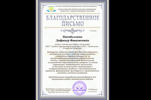 Конкурсная комиссия и председатель конкурсной комиссии ООО "НПЦ ИНТЕРТЕХИНФОРМ" кандидат технологических наук А.В. Каргин выражает благодарность Насибуллиной Дифинур Фавазисовне за активное участие в работе педагогического сообщества портала конкурс.net по распространению успешного педагогического опыта и научно- методической деятельности по разработке образовательных ресурсов на основе современных педагогических технологий, за большой личный вклад в организацию и совершенствование учебного и воспитательного процессов, формирование культурного и нравственного развития личности учащегося.
