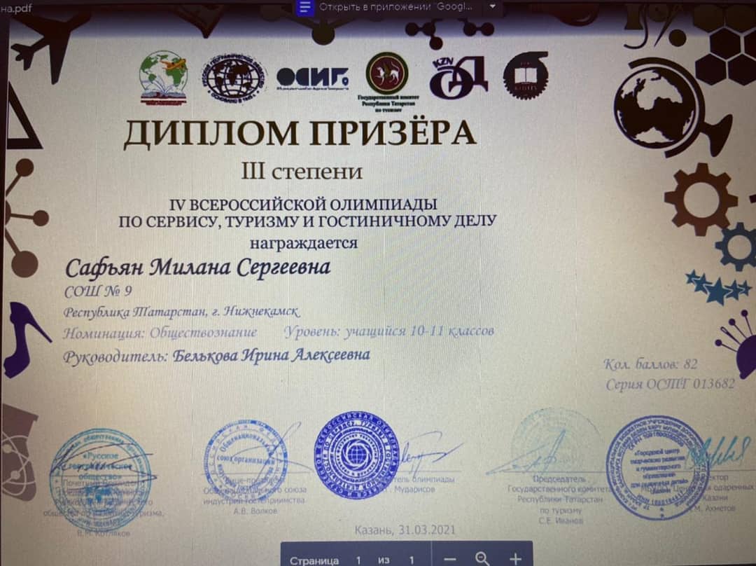 Поздравляем Ирину Алексеевну и Сафьян Милану, ученицу 11а класса, с призовым местом на IV Всероссийской олимпиаде по сервису, туризму и гостиничному делу.
