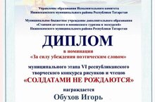Новый успех ! Учащийся 7Б класса Обухов Игорь принял участие в 6-м республиканском творческом конкурсе чтецов «Солдатами не рождаются». Он подготовил свое стихотворение «Письмо солдату», обращенное к героическим участникам специальной военной операции. Стихотворение Игоря отмечено дипломом конкурса «За силу убеждения поэтическим словом». Надеемся, что теплые слова Игоря, обращённые к землякам, согреют наших бойцов и вдохновят на новые победы !
