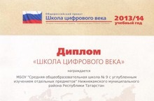 МБОУ "СОШ №9" награждена за участие в Общероссийском проекте "Школа цифрового века" и за использование педагогическим коллективом возможностей современных информационных технологий и цифровых предметно-методических материалов, представленных в рамках проекта.
