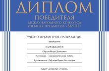 Работа учащегося 6Б класса Обухова Игоря "Воин, фронтовик, педагог" была посвящена военному руководителю нашей школы, ветерану Великой Отечественной войны Кронидту Николаевичу Шульпину. С результатами своего исследования Игорь плодотворно участвовал сразу в двух конкурсах. В международном конкурсе учебных предметов ВКУПЕ" он завоевал диплом победителя! Региональный конкурс исследовательских, методических и творческих работ принес Игорю диплом первой степени ! Молодец ! Гордимся ! Так держать !