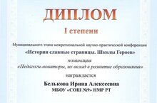 В очередной раз педагоги и учащиеся нашей школы успешно участвовали в муниципальном конкурсе республиканской конференции «Истории славные страницы. Школы Героев». В номинации «Педагоги – новаторы, их вклад в развитие образования» победила учитель истории Ирина Алексеевна Белькова с работой «Учитель учителей. Директор директоров» о прославленном педагоге, директоре нашей школы Люцие Султановне Латиповой. В номинации «Мой учитель – Герой» об учителе начальной военной подготовки, ветеране Великой Отечественной войны Кронидте Николаевиче Шульпине диплом второй степени завоевал ученик 6Б класса Игорь Обухов (руководитель Ирина Витальевна Обухова). Пожелаем им победы и на республиканском уровне!