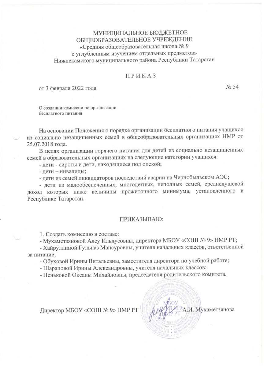 Приказ по СОШ № 9 О создании комиссии по бесплатному питанию