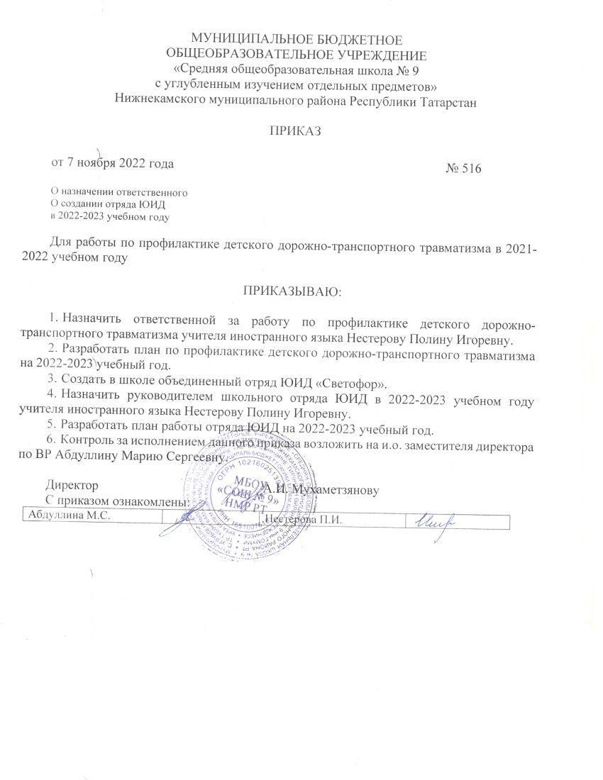 Приказ о назначении ответственного за работу по профилактите ДДТТ и о создании отряда ЮИД