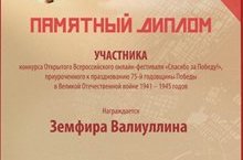 Мы искренне поздравляем Валиуллину Земфиру с получением памятного диплома Открытого Всеройсийского онлайн-фестиваля «Спасибо за Победу», приуроченного к празднованию 75-й годовщины Победы в Великой Отечественой войне 1941-1945 годов.