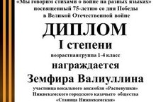 Великий День Победы прошёл, а результаты участий конкурсе продолжают радовать. Мы хотим поздравить ученицу 3 класса Валиуллину Земфиру, которая приняла участие в конкурсе, посвящённом 75-летию Победы в Великой Отечественной войне, от МАУ «Дом Дружбы народов». Из множества участников Земфира стала обладательницей диплома 1 степени за свой вложенный труд! Нам радостно поздравить Земфиру с этой победой, а всех ещё раз поздравить с этим знаменательным днём нашей Великой Победы над фашизмом!