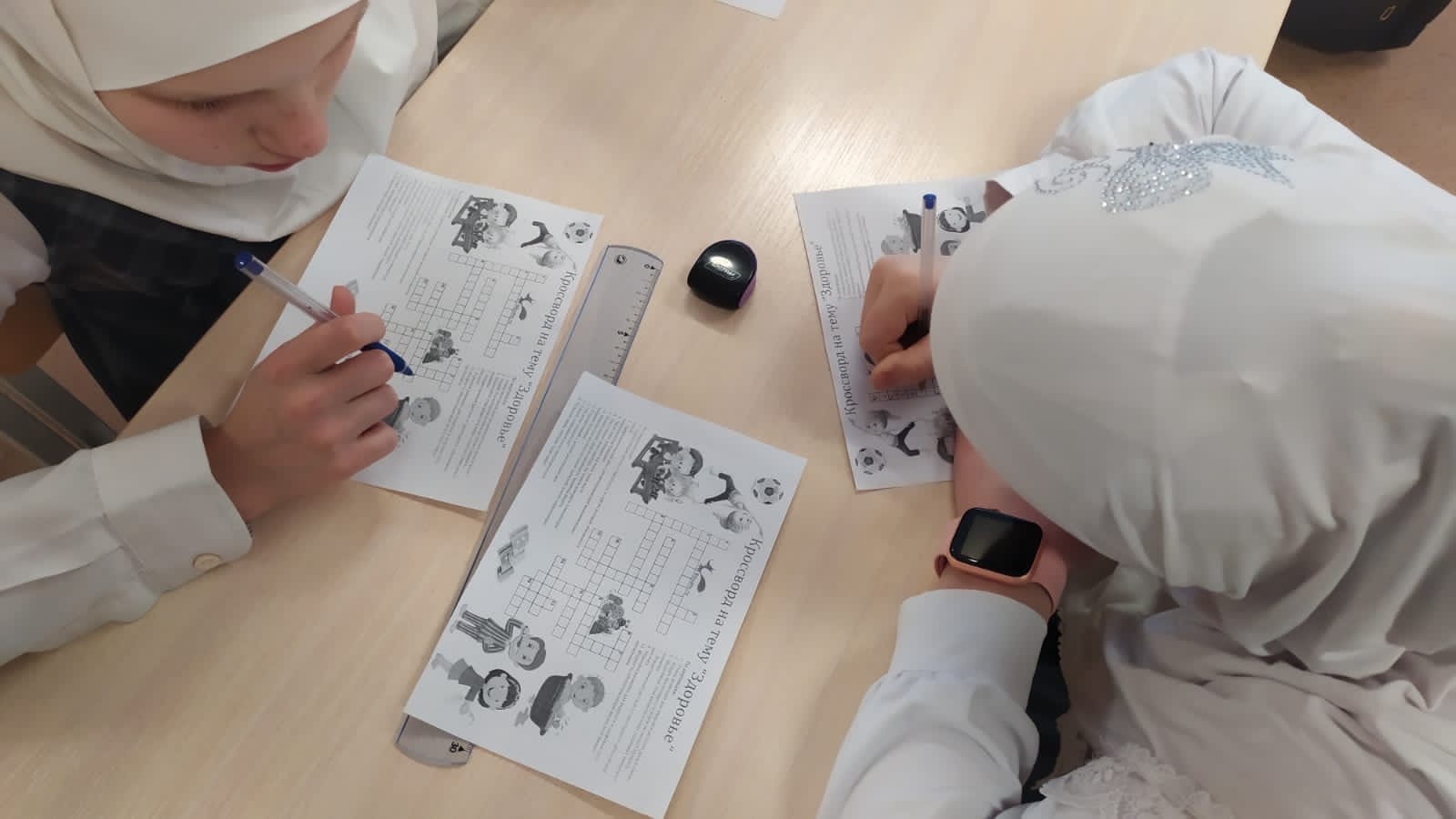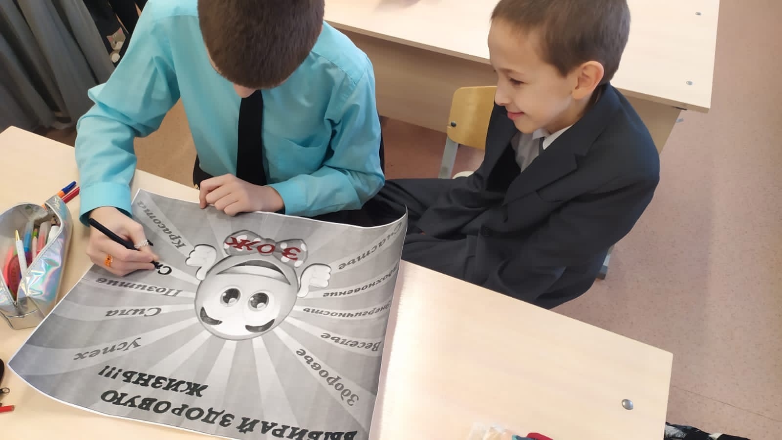 Ученики 5 класса раздали всем школьникам и ученикам красные ленточки. Было проведено внеклассное мероприятие "Мы за здоровый образ жизни!". Ученики самостоятельно подготовили плакат и решили кроссворд по теме ЗОЖ.