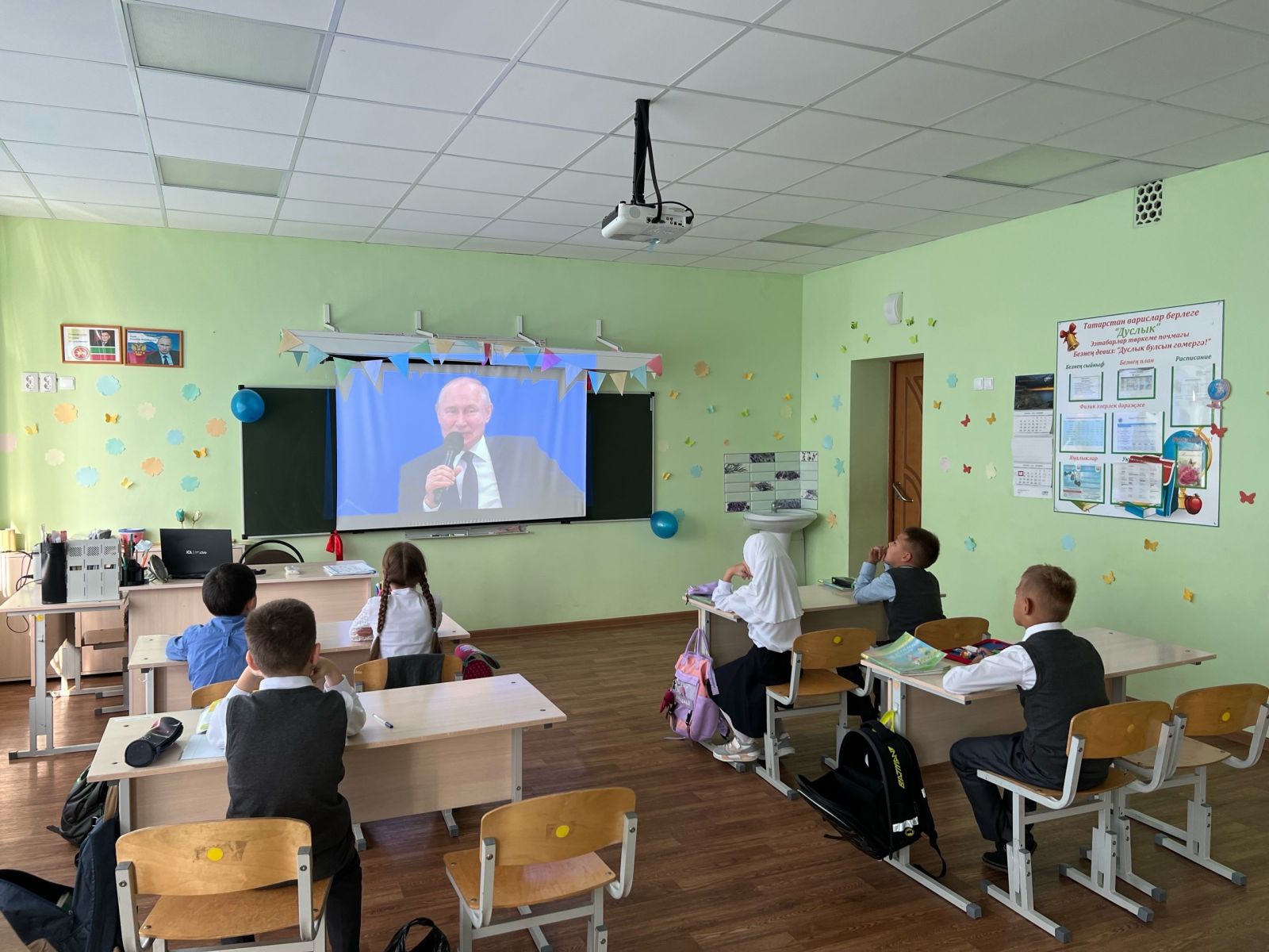 День знаний-это праздник, который напоминает нам о том, как ценно образование, насколько для каждого школьника актуально стремление его получить, чтобы найти свое место в мире, овладеть профессией, которая будет полезна людям, стране. Обучающиеся посмотрели видеофрагмент встречи В.В. Путина с победителями международных олимпиад и авторами социальных проектов. Также просмотрели демонстрацию видеообращения федерального спикера Юрия Павловича Вяземского, автора и ведущего программы «Умники и умницы».