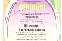 Евстафьева Иделия заняла призовое третье место в республиканском конкурсе "Красочное лето - 2020" в номинации:актерское мастерство.