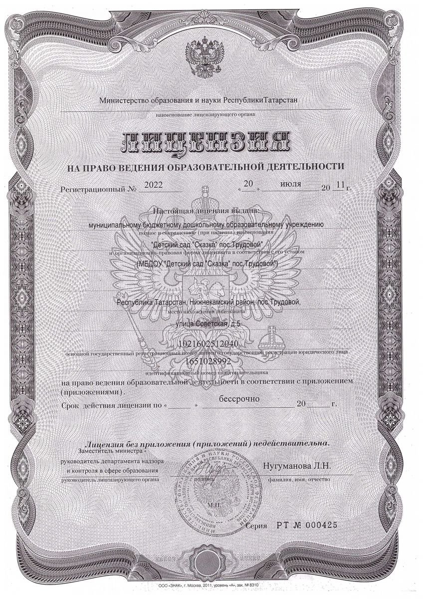 Муниципальное бюджетное дошкольное образовательное учреждение "Детский сад "Сказка" пос.Трудовой" Нижнекамского муниципального района Республики Татарстан (сокращенное наименование МБДОУ "Детский сад "Сказка" пос.Трудовой" НМР РТ)