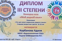 "Минем авылым: тарихы һәм киләчәге" проекты кысаларында оештырылган "Минем туган телем" эссе язу конкурсында призлы урын 25.03.2021