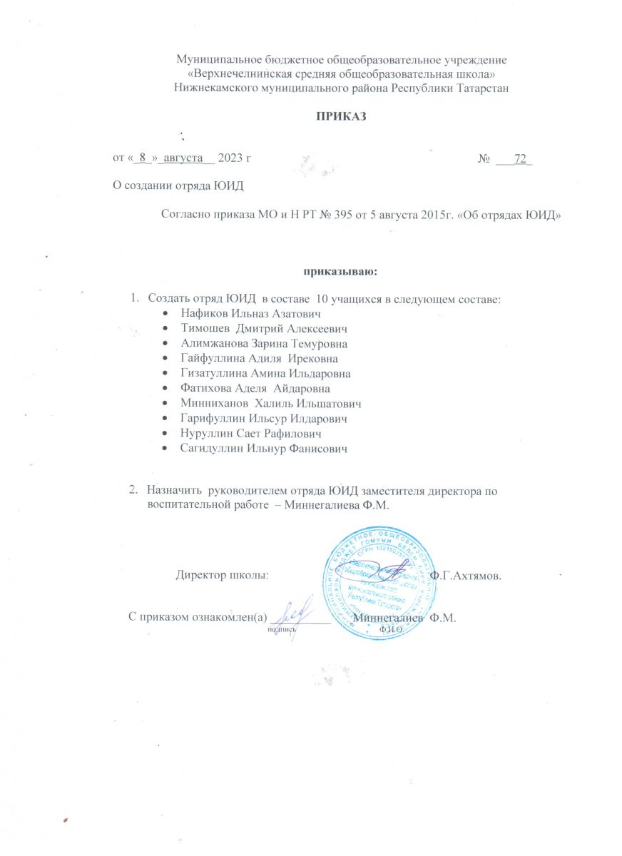 Приказ о создании отряда ЮИД и назначении руководителя отряда на 2023-2024 учебный год