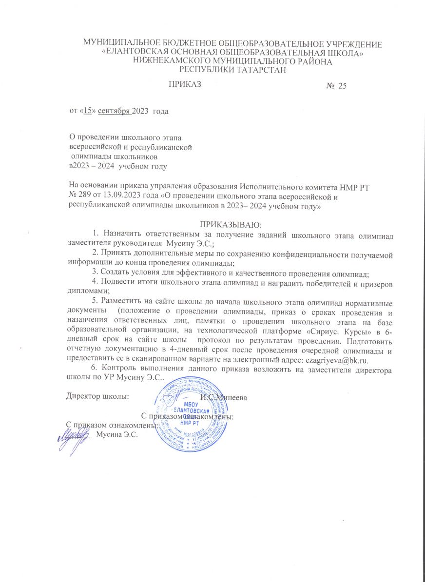 Приказ МБОУ "Елантовская ООШ" о проведении школьного этапа олимпиад в 2023-24 учебном году