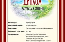 Дипломом лауреата 2 степени награжден танцевальный коллектив "Жемчужинки"на XV фольклорно-этнографическом фестивале-конкурсе"Апрельские проталинки"воспитанников дошкольных учреждений Вахитовского и Приволжского районов г .Казани, Музыкальный руководитель Шарапова Гульфия Замилевна